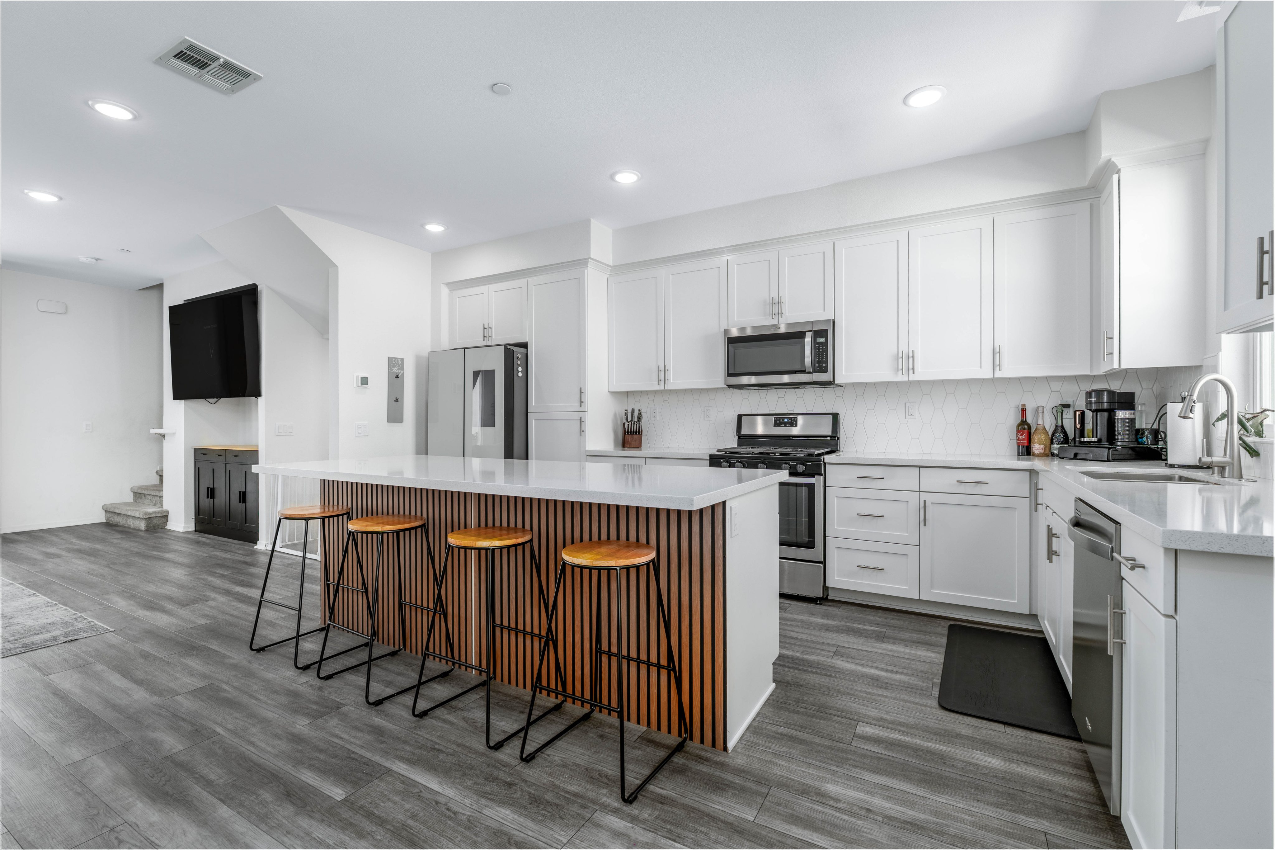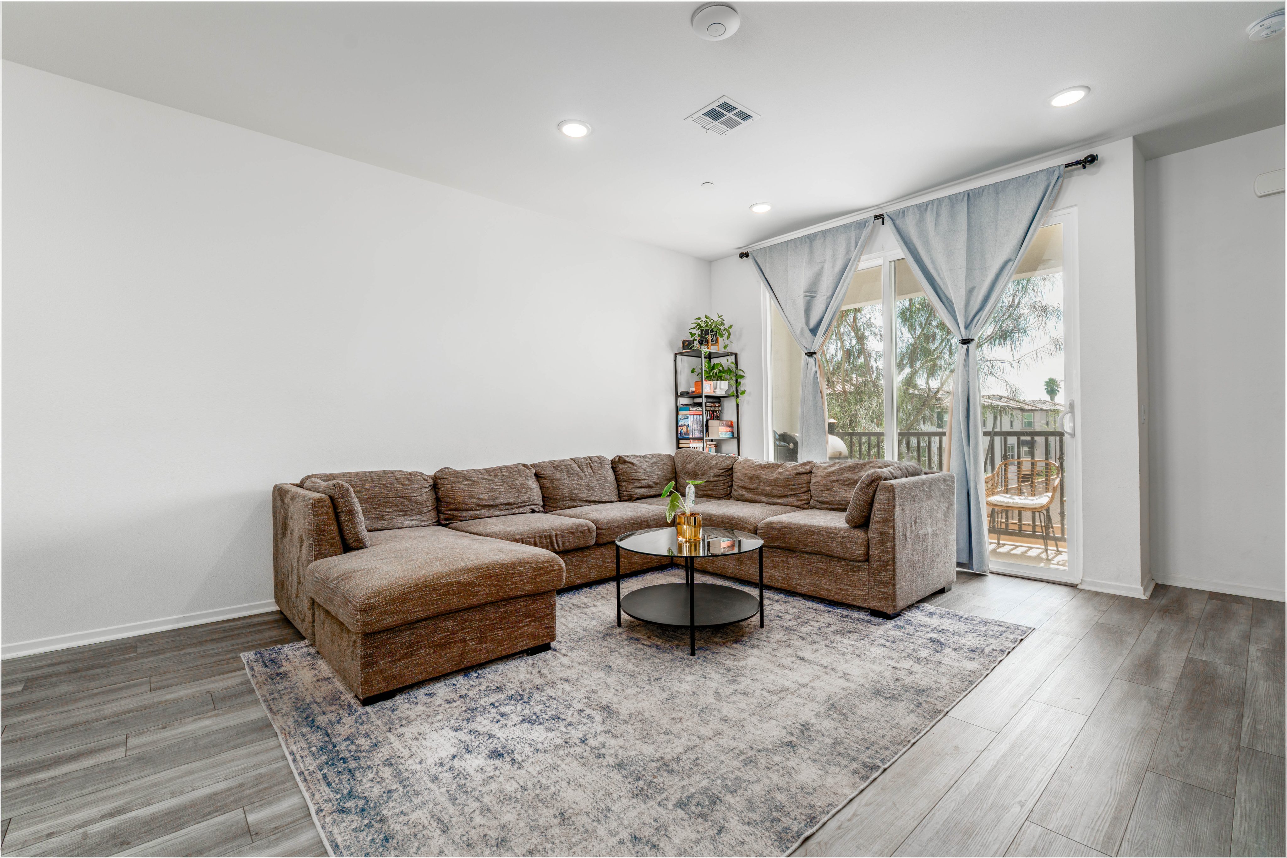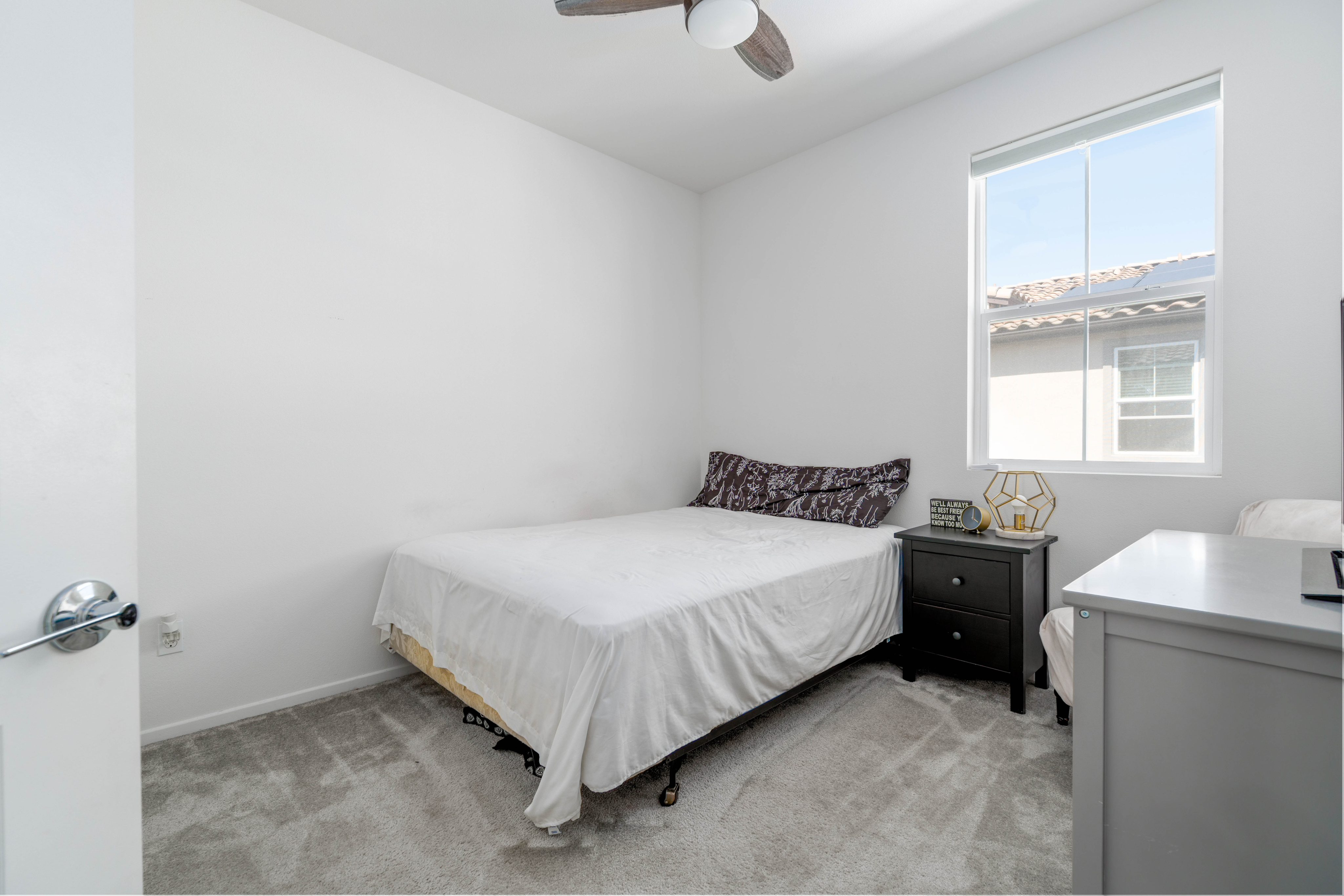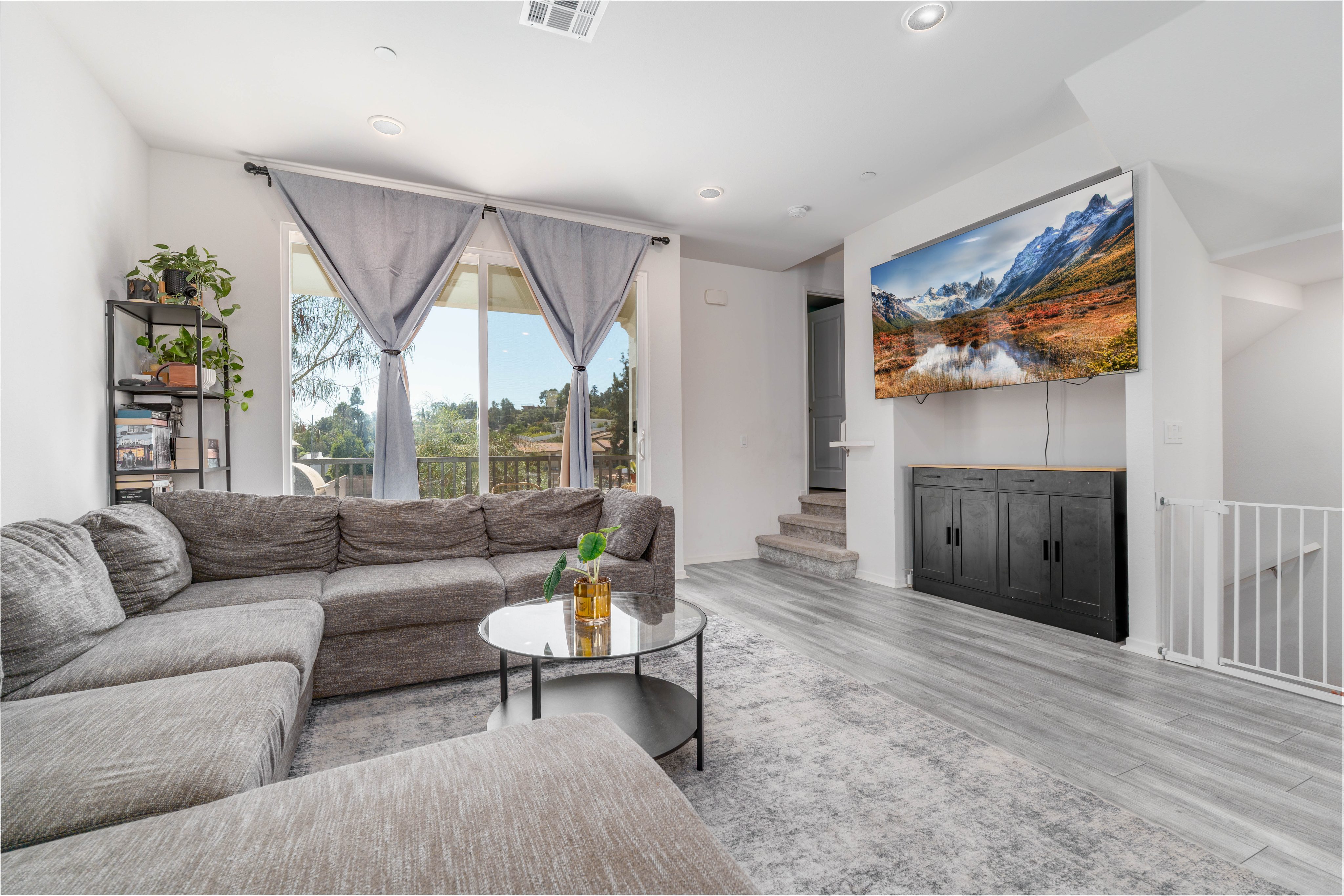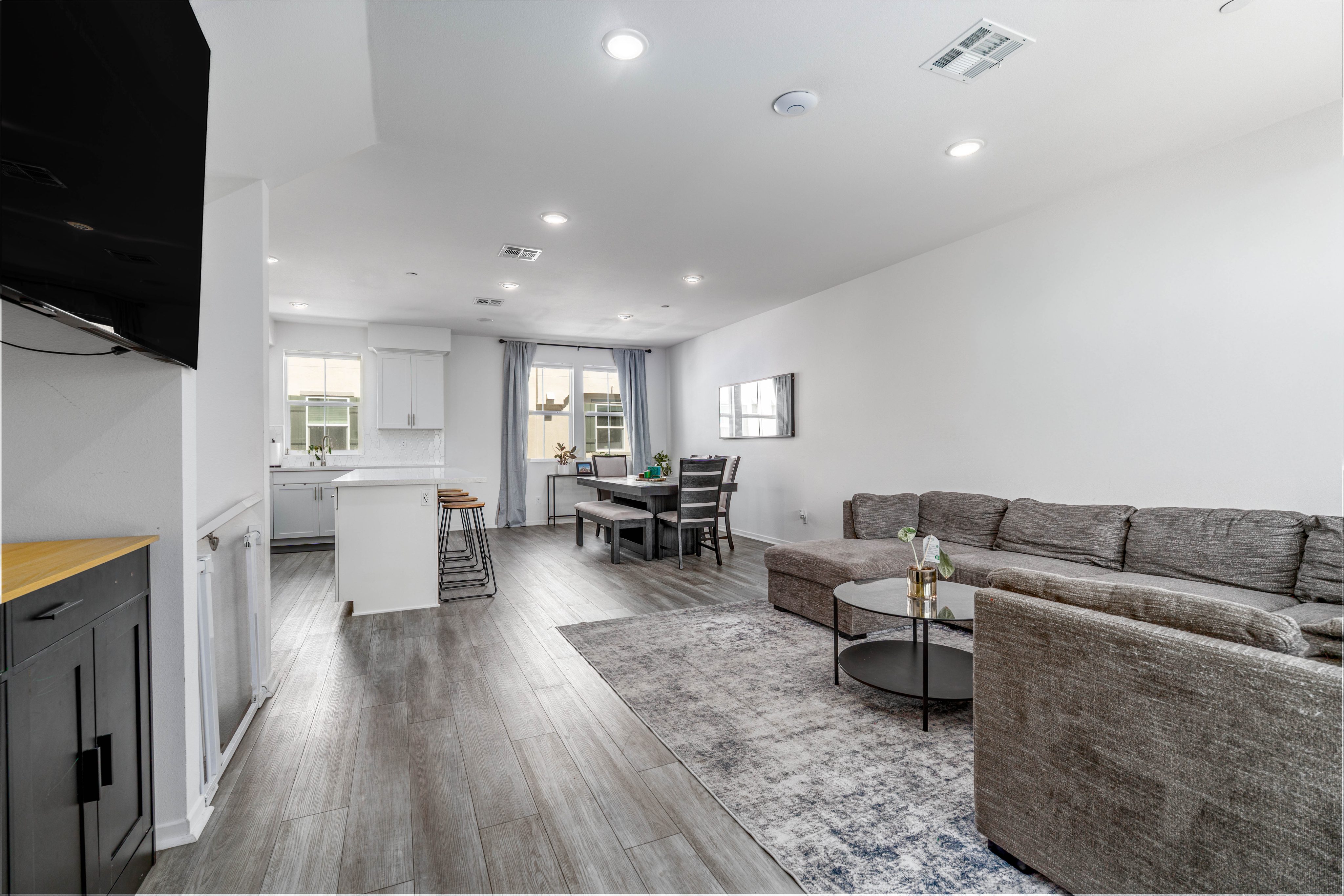 The LARGEST floor plan in this sought-after Escondido community, offering modern living across all levels and PAID OFF solar! The home features a versatile first-floor flex space, a spacious open-concept main living area, and a bright kitchen with a 5 burner stove, Smart refrigerator, and tiled backsplash. The primary suite includes an upgraded tiled shower and walk-in closet, while all bedrooms are equipped with ceiling fans for year-round comfort. Stylish upgrades include luxury vinyl plank flooring throughout the main living areas, tiled bathrooms, and a private deck off the living room. Energy efficiency is built in with a tankless water heater, Quick Cool fan system, and a 3.5kW solar system, complemented by smart home features such as app-controlled lighting, thermostats, and a garage door with integrated camera. Residents enjoy resort-style amenities including a sparkling pool and spa, fire fit, lounge area, multiple BBQs, a children's playground, and a shared outdoor patio with TV and seating. An indoor community gym is also planned. Perfectly situated at the quiet back end of the neighborhood, the home offers added privacy while still being close to everyday conveniences. Just off Interstate 15, you'll have quick access to stores, gas stations, and vibrant dining. This turnkey home combines comfort, innovation, and location -- ready for its next chapter.